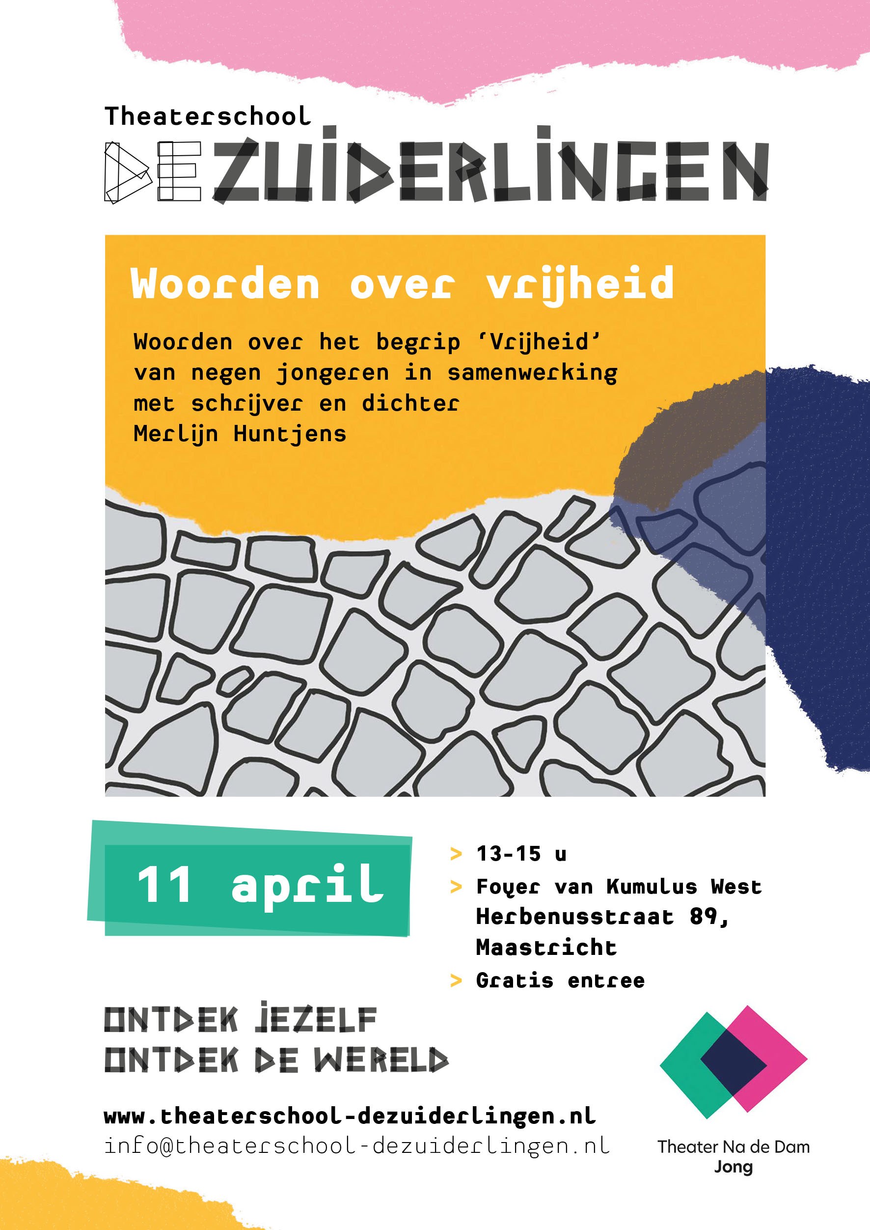 Voor de vierde maal doet Theaterschool de Zuiderlingen mee aan het landelijke initiatief Theater na de Dam. Negen jongeren buigen zich, samen met schrijver en dichter Merlijn Huntjens, over het begrip Vrijheid. Dat doen we in samenwerking met Het Struikelsteentjescomité en het Herdenkingscomité.